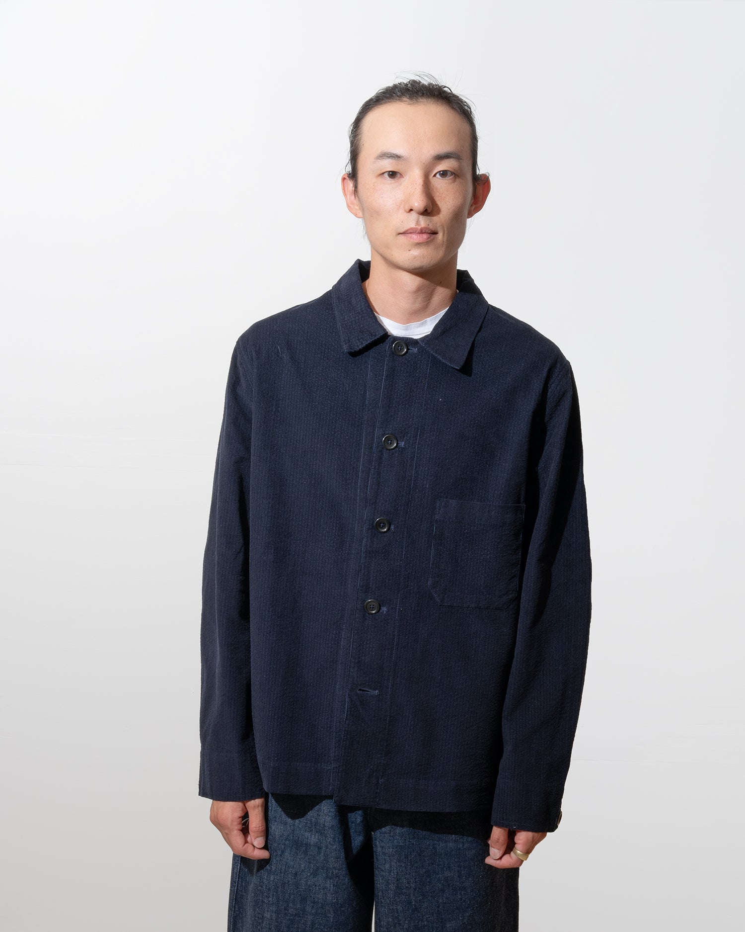 A RELAXED FITTING FIVE BUTTON OVERSHIRT FABRICATED FROM A FLUID JAPANESE COTTON RIPPLE CORDUROY. THE FABRIC HAS A CLASSIC CORDUROY FINE WALE ON ITS FACE WHICH IS RENDERED MUTABLE BY A SEERSUCKER STITCH PATTERN ON THE REVERSE. THE INTERPLAY BETWEEN THE STRUCTURE OF THE CORDUROY AND THE VACILLATION OF THE SEERSUCKER "RIPPLE" LENDS THIS FABRIC A UNIQUE BOUNCE AND DRAPE. FEATURES A CONVERTIBLE COLLAR, FLAT HEM, LEFT SIDE MITRED BREAST POCKET, AND COROZO BUTTONS. SUBTLE STRUCTURE THROUGHOUT IS CONFERRED THROUGH A SLIGHTLY DROPPED SHOULDER, AND CURVED AND VOLUMINOUS TWO PIECE SLEEVE ASSEMBLY WHICH IS TEMPERED BY A SINGLE BUTTON SQUARE CUFF. A MIX OF FLAT FELLED AND BOUND FRENCH SEAMS MAKE FOR A HARD WEARING AND CLEAN INTERIOR FINISH.